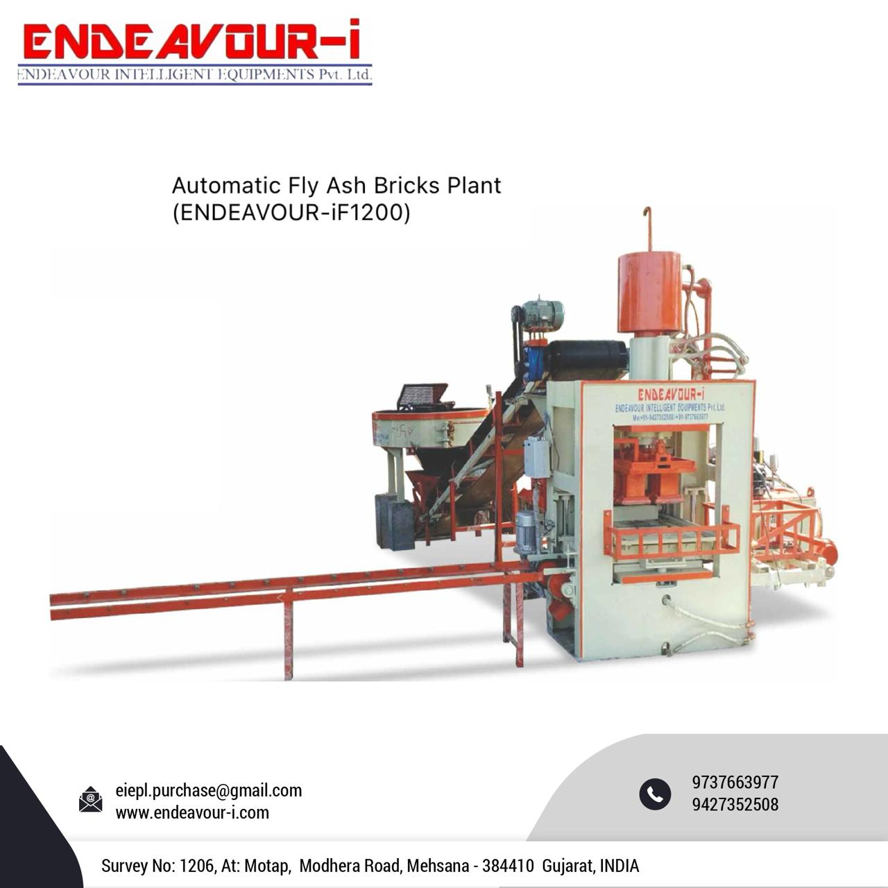 Automatic Fly Ash Bricks Plant Model: ENDEAVOUR-iF1200 Production Capacity: 4 Bricks per Stroke / 1000-1200 Bricks per Hour Standard Bricks Size: 230 X 110 X 75 mm (Size Options Available) Pressing Capacity: 45 Tons Max. Pan Mixer Capacity: 400 Kgs per Batch – 1 Mixer Hydraulic Tank Capacity: 250 Ltrs Control Panel: User Friendly PLC Based Control Panel with Touch Screen Display Pallet Size: 570 X 350 X 19 mm Connected Power: 19.5 HP / 14.625 KW / 3 Phase / 440 Volts / 50 Htz Details & Specifications are subjected to change without Prior Notice. Please Contact us for more details: ENDEAVOUR INTELLIGENT EQUIPMENTS PRIVATE LIMITED Survey No: 1206, At: Motap, Ta: Becharaji, Dist: Mehsana, Modhera Road, Mehsana, Gujarat - 384410 E Mail: endeavourintelligent@gmail.com Website: www.endeavour-i.com Mobile: Mr. Dinesh K Suthar: +91-9427352508 Mr. Piyush K Suthar: +91-9737663977 Endeavour Intelligent Equipments Private Limited is Leading Manufacturer of Fly Ash Brick Machine, Fly Ash Bricks Machine, Fly Ash Brick Plant, Fly Ash Bricks Plant, Fly Ash Brick Making Machine, Fly Ash Bricks Making Machine, Fly Ash Brick Making Plant, Fly Ash Bricks Making Plant, Automatic Fly Ash Brick Machine, Automatic Fly Ash Bricks Machine, Automatic Fly Ash Brick Plant, Automatic Fly Ash Bricks Plant, Automatic Fly Ash Brick Making Machine, Automatic Fly Ash Bricks Making Machine, Automatic Fly Ash Brick Making Plant, Automatic Fly Ash Bricks Making Plant, Concrete Block Machine, Concrete Blocks Machine, Concrete Block Plant, Concrete Blocks Plant, Concrete Block Making Machine, Concrete Blocks Making Machine, Concrete Block Making Plant, Concrete Blocks Making Plant, Automatic Concrete Block Machine, Automatic Concrete Blocks Machine, Automatic Concrete Block Plant, Automatic Concrete Blocks Plant, Automatic Concrete Block Making Machine, Automatic Concrete Blocks Making Machine, Automatic Concrete Block Making Plant, Automatic Concrete Blocks Making Plant, Autoclaved Aerated Concrete Block Machine, Autoclaved Aerated Concrete Blocks Machine, Autoclaved Aerated Concrete Block Plant, Autoclaved Aerated Concrete Blocks Plant, Autoclaved Aerated Concrete Block Making Machine, Autoclaved Aerated Concrete Blocks Making Machine, Autoclaved Aerated Concrete Block Making Plant, Autoclaved Aerated Concrete Blocks Making Plant, Automatic Autoclaved Aerated Concrete Block Machine, Automatic Autoclaved Aerated Concrete Blocks Machine, Automatic Autoclaved Aerated Concrete Block Plant, Automatic Autoclaved Aerated Concrete Blocks Plant, Automatic Autoclaved Aerated Concrete Block Making Machine, Automatic Autoclaved Aerated Concrete Blocks Making Machine, Automatic Autoclaved Aerated Concrete Block Making Plant, Automatic Autoclaved Aerated Concrete Blocks Making Plant, AAC Block Machine, AAC Blocks Machine, AAC Block Plant, AAC Blocks Plant, AAC Block Making Machine, AAC Blocks Making Machine, AAC Block Making Plant, AAC Blocks Making Plant, Automatic AAC Block Machine, Automatic AAC Blocks Machine, Automatic AAC Block Plant, Automatic AAC Blocks Plant, Automatic AAC Block Making Machine, Automatic AAC Blocks Making Machine, Automatic AAC Block Making Plant, Automatic AAC Blocks Making Plant, Light Weight Concrete Block Machine, Light Weight Concrete Blocks Machine, Light Weight Concrete Block Plant, Light Weight Concrete Blocks Plant, Light Weight Concrete Block Making Machine, Light Weight Concrete Blocks Making Machine, Light Weight Concrete Block Making Plant, Light Weight Concrete Blocks Making Plant, Automatic Light Weight Concrete Block Machine, Automatic Light Weight Concrete Blocks Machine, Automatic Light Weight Concrete Block Plant, Automatic Light Weight Concrete Blocks Plant, Automatic Light Weight Concrete Block Making Machine, Automatic Light Weight Concrete Blocks Making Machine, Automatic Light Weight Concrete Block Making Plant, Automatic Light Weight Concrete Blocks Making Plant etc…