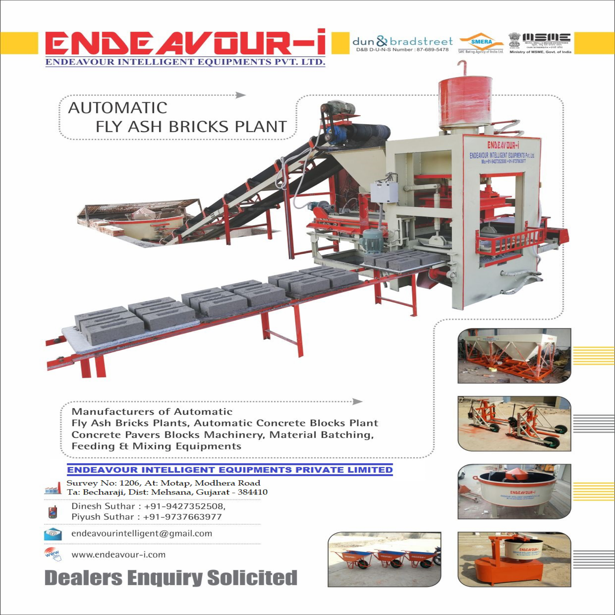 Automatic Fly Ash Bricks Plant Model: ENDEAVOUR-iF1500 Production Capacity: 6 Bricks per Stroke / 1300-1500 Bricks per Hour Standard Bricks Size: 230 X 110 X 75 mm (Size Options Available) Pressing Capacity: 60 Tons Max. Pan Mixer Capacity: 600 Kgs per Batch – 1 Mixer Hydraulic Tank Capacity: 250 Ltrs Control Panel: User Friendly PLC Based Control Panel with Touch Screen Display Pallet Size: 570 X 430 X 19 mm Connected Power: 23 HP / 17.25 KW / 3 Phase / 440 Volts / 50 Htz Details & Specifications are subjected to change without Prior Notice. Please Contact for More Details: ENDEAVOUR INTELLIGENT EQUIPMENTS Pvt. Ltd. Survey No: 1206, At: Motap, Ta: Becharaji, Dist: Mehsana Modhera Road, Mehsana-384410, Gujarat INDIA Mobile: +91-9427352508 +91-9737663977 E Mail: endeavourintelligent@gmail.com Website: www.endeavour-i.com #Fly_Ash_Bricks_Plant #Fly_Ash_Bricks_Machine #Fly_Ash_Bricks_Making_Plant #Fly_Ash_Bricks_Making_Machine #Automatic_Fly_Ash_Bricks_Plant #Automatic_Fly_Ash_Bricks_Machine #Automatic_Fly_Ash_Bricks_Making_Plant #Automatic_Fly_Ash_Bricks_Making_Machine #Concrete_Block_Plant #Concrete_Block_Machine #Concrete_Block_Making_Plant #Concrete_Block_Making_Machine #Automatic_Concrete_Block_Bricks_Plant #Automatic_Concrete_Block_Machine #Automatic_Concrete_Block_Making_Plant #Automatic_Concrete_Block_Making_Machine #Fly_Ash_Brick_Industry #Ash_Brick_Manufacturing_Unit #Fly_Ash_Bricks_Project_Report #Fly_Ash_Bricks_Making_Process